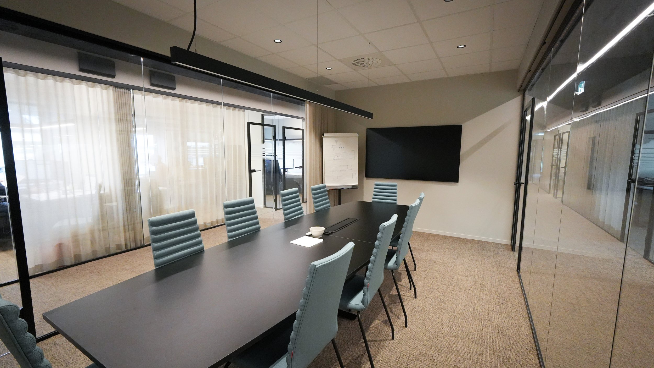 Begge møterommene er utstyrt med store skjermer og moderne tilkoblingsløsninger som legger til rette for både fysiske møter og videokonferanser. Det er lagt vekt på funksjonalitet, akustikk og teknisk kvalitet, slik at rommene fremstår representative, komfortable og enkle å bruke i det daglige.